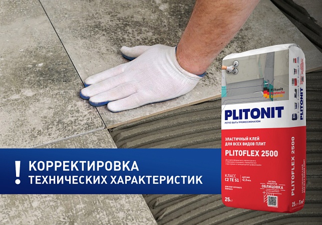 Обращаем Ваше внимание на корректировку технических характеристик эластичного клея PLITOFLEX 2500. В ближайшие месяцы в продаже может находиться продукт со старым описанием на упаковке, поэтому необходимо ориентироваться на информацию, размещённую на страничке продукта и в технической спецификации.