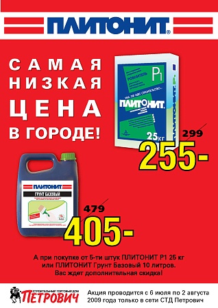 С 6 июля по 2 августа только в сети СТД Петрович цена на ПЛИТОНИТ Р1 (25 кг) - 255 руб., а на ПЛИТОНИТ Грунт Базовый (10 л) - 405 руб.