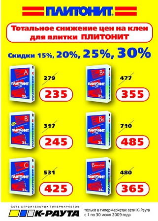 Весь июнь в Санкт-Петербурге в сети строительных гипермаркетов К-Раута ТОТАЛЬНОЕ СНИЖЕНИЕ ЦЕН НА КЛЕИ ДЛЯ ПЛИТКИ ПЛИТОНИТ! Скидки от 15 до 30%!