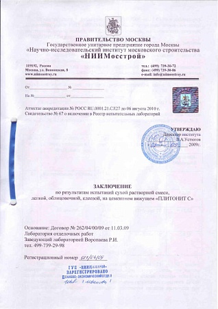 Получено Заключение по результатам испытаний, проведенным Государственным унитарным предприятием города Москвы "Научно-исследовательский институт московского строительства "НИИМосстрой"" клеевого состава ПЛИТОНИТ С.