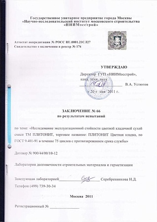В лаборатории долговечности строительных материалов и герметизации ГУП "НИИМосстрой" проводились испытания образцов цветной кладочной сухой строительной смеси ТМ ПЛИТОНИТ Цветная Кладка.
