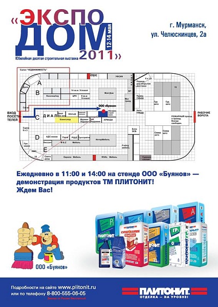 Десятая юбилейная строительная выставка «ЭКСПО ДОМ 2011», состоится с 12 – 14 мая 2011 года в Ледовом дворце г. Мурманска. Следуйте схеме и обязательно посетите выставочный стенд ТМ ПЛИТОНИТ. Наши специалисты будут рады продемонстрировать наш ассортимент и ответить на все интересующие вопросы!