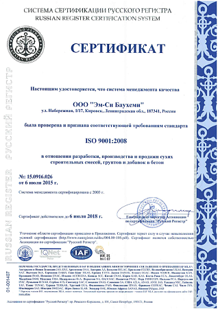 Компания MC-Bauchemie (Россия). проивзодитель отделочных материалов ТМ ПЛИТОНИТ, в очередной раз подтвердила статус компании, работающей в соответствии с требованиями ГОСТ, о чем свидетельствует Сертификат соответствия системы менеджмента качества стандартам работы ИСО 9001:2008 в отношении разработки, производства и продажи сухих строительных смесей, грунтов и добавок в бетон, полученный 06 июля 2012 года. Сертификат также доступен на английском языке в разделе Сертификаты нашего сайта.