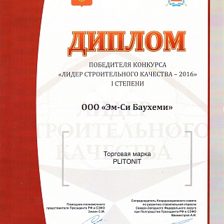 В октябре 2016 года торговая марка Plitonit получила диплом первой степени в конкурсе «Лидер строительного качества» в номинации «Лучший строительный материал».