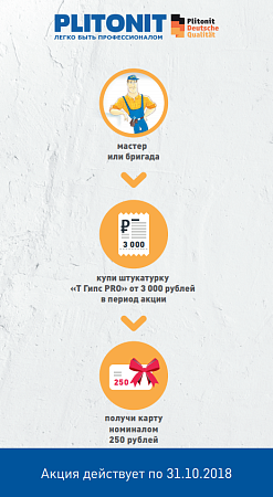 Первым 60 клиентам при накопительной покупке штукатурки «Т Гипс PRO» Plitonit на сумму от 3 000 рублей – карта номиналом 250 рублей в подарок!