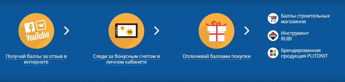 Баллы начисляются за отзывы о продукции PLITONIT в социальных сетях. Если у вас есть опыт работы с материалами PLITONIT, и вы поделились им в одной из социальных сетей, то можете прислать нам ссылку на отзыв через форму в личном кабинете и получить баллы.