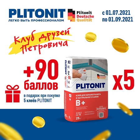 2) За каждую покупку 5 клеёв PLITONIT будет начислено 90 баллов Клуба Друзей Петрович.