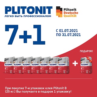 1) При покупке 7-и упаковок штукатурки Plitonit Т1+ (25 кг.) Вы получаете в подарок 1 упаковку!