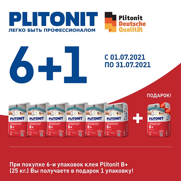 3) При покупке 6-и упаковок клея Plitonit В+ (25 кг.) Вы получаете в подарок 1 упаковку!