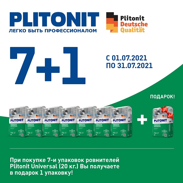 4) При покупке 7-и упаковок ровнителей Plitonit Universal (20 кг.) Вы получаете в подарок 1 упаковку!
