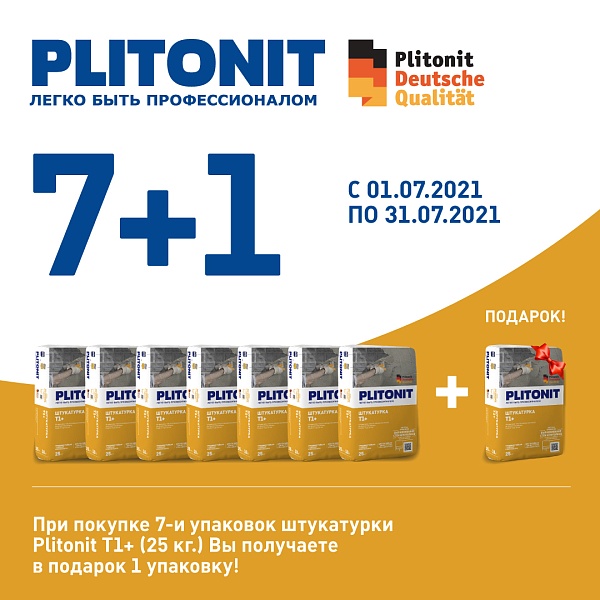 1) При покупке 7-и упаковок штукатурки Plitonit Т1+ (25 кг.) Вы получаете в подарок 1 упаковку!