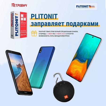 С 1 июня по 31 июля 2020 г. покупайте любую продукцию Plitonit и выигрывайте ценные подарки: смартфон, портативную колонку, топливную карту или другие призы. У нас будет 153 победителя по суммам покупок Plitonit в каждом федеральном округе: Санкт-Петербург и Северо-Западный федеральный округ и Москва и Центральный федеральный округ.