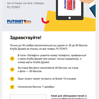 В акции примут участие все отзывы на материалы PLITONIT со страницы Список товаров, опубликованные с 01 ноября по 30 ноября 2020 года.