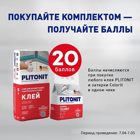 При покупке любого клея для плитки ТМ Plitonit и затирки Colorit, дарим 20 баллов на карту Клуба друзей Петровича!