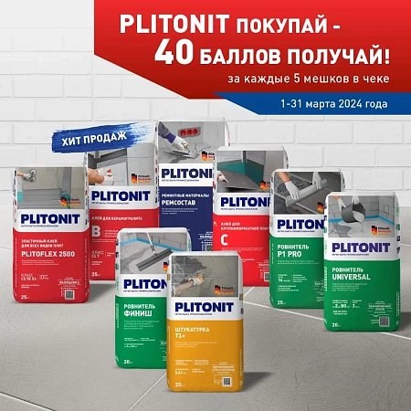 При покупке 5 мешков акционных товаров PLITONIT, 40 баллов в ПОДАРОК!