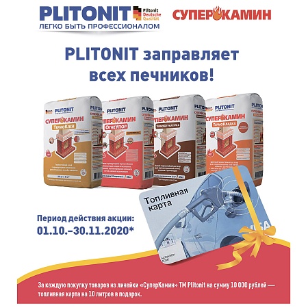 За каждую покупку товаров из линейки "СуперКамин" ТМ Plitonit на сумму 10 000 рублей - топливная карта на 10 литров в подарок.