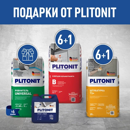 - Условия участия в акции: скидка на комплект при покупке 6 мешков ровнителя PLITONIT Universal и грунта PLITONIT PROFI 1 3 л., а также 7-ой мешок в подарок при покупке 6 мешков Клея B или Штукатурки Т1+