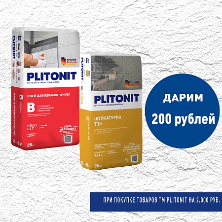 - товары-участники акции: PLITONIT В, усиленный армирующими волокнами 25 кг, PLITONIT Universal 20 кг, PLITONIT Т1+ 25 кг/ 5кг, PLITONIT Манжета гидроизоляционная напольная 425х425мм, PLITONIT ГидроЛента угол внутренний 90°, PLITONIT ГидроЛента угол внешний 270°, PLITONIT Манжета гидроизоляционная настенная 120х120 мм, PLITONIT ГидроЭласт, зажим PLITONIT PROFI, клин PLITONIT PROFI, PLITONIT Готовый Грунт 10 л, PLITONIT Грунт Упрочняющий 10л, PLITONIT РемСостав