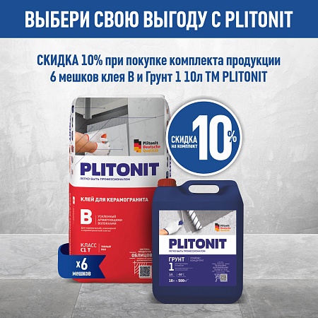 - Условия участия в акции: скидка 10% на комплект при покупке 6 мешков PLITONIT В усиленный и PLITONIT Грунт 1 10 л.