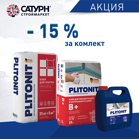 C 20 апреля до 15 июня 2021 г. действует скидка -15% на комплект: при покупке 5 упаковок клея PLITONIT одного наименования и 1 упаковки грунта Plitonit «Грунт 1 Plitonit Концентрат 1:5 (3 л)».