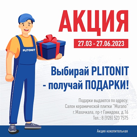 1) С 27 марта по 27 июня 2023 г. совершите покупку продукции ТМ Plitonit в торговой сети «Murano» на указанную ниже сумму и получите соответствующий подарок.