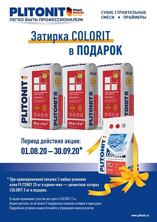 При единовременной покупке трех упаковок клеев Plitonit (25 кг.) в одном чеке – цементная затирка Colorit (2 кг.) в подарок.
