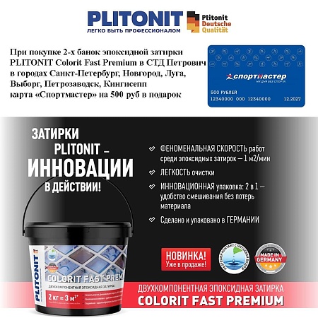 При единовременной покупке двух банок эпоксидной затирки Colorit Fast Premium - карта Спортмастер номиналом 500 руб. в подарок.