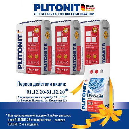 При единовременной покупке трех упаковок клеев Plitonit (25 кг.) в одном чеке – затирка Colorit (2 кг.) в подарок (1 шт.)