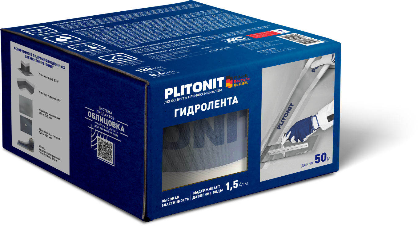 PLITONIT ГидроЛента применяется в системе с полимерной гидроизоляцией PLITONIT ГидроЭласт. Гидроизоляционная мастика PLITONIT ГидроЭласт подходит для душевых, в том числе без поддона, ванных комнат и других влажных помещений, может применяться для гидроизоляции балкона под дальнейшую облицовку плиткой.