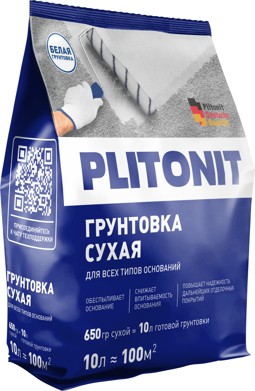 PLITONIT Грунтовка Сухая предназначена для изготовления жидких грунтовок для подготовки стен, полов и потолков на цементной, цементно-известковой или гипсовой основе, гипсокартонных листов перед применением растворных смесей на цементной или гипсовой основе, на полимерном связующем, а также перед окраской и оклейкой обоями с целью обеспыливания основания, снижения водопоглощения, устранения преждевременного оттока влаги из растворной смеси перед проведением внутренних и наружных работ.