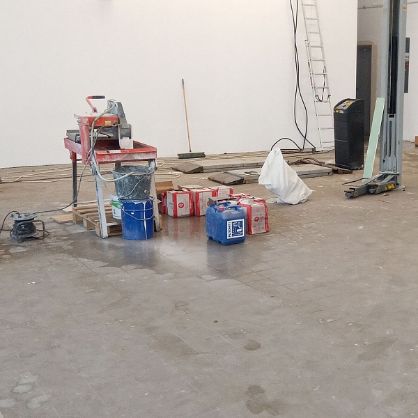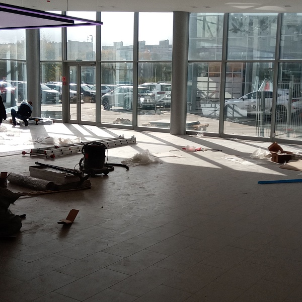 Произведена заливка пола в клиентской зоне – PLITONIT Р2 с предварительной грунтовкой PLITONIT СуперПол, облицовка пола в клиентской зоне и зоне сервиса керамогранитом различного формата клеем PLITONIT С.