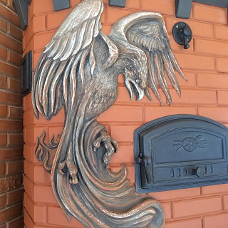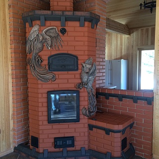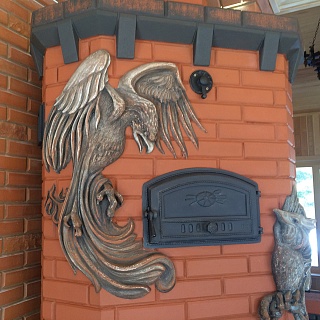 Печь выполнена мастером-печником и полномочным представителем Русского печного общества Максимом Герасимовым. Изюминкой печи являются объемные фигуры в виде птиц на кирпичной кладке.